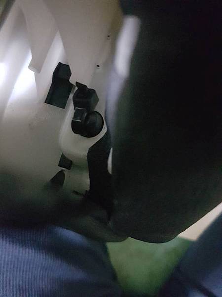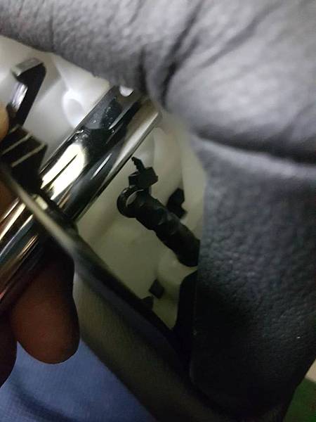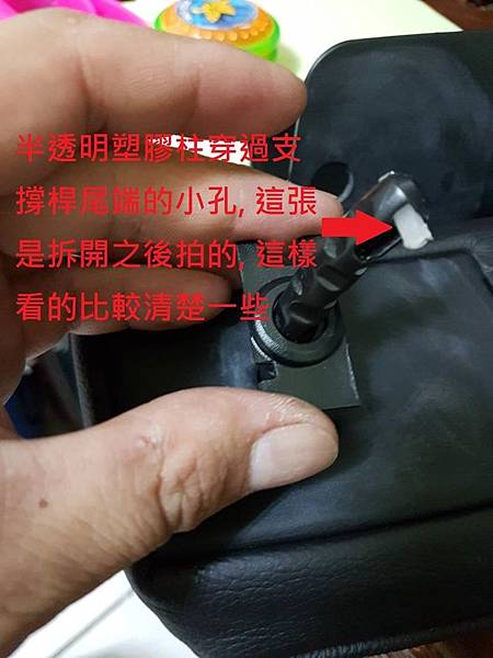 往上翹起來之後不要太大力,撥開一個縫就可以,可以看到頭枕的可動片的後面有一個支撐桿,支撐桿的尾端有個小孔,原廠用一根半透明的塑膠條穿過那個小孔,讓支撐桿不會被拉出來,請看照片: