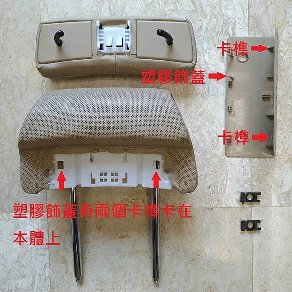 可動片取下來之後在頭枕下半部的塑膠飾蓋也可以用個小起子向下方撬一下就可以取下,塑膠飾蓋下面原來有兩個卡榫卡在頭枕的本體上,整個飾蓋向下方取出之後大部分解就完成了,請看照片: