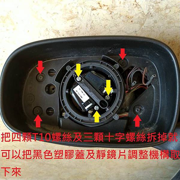 但鏡片後面有兩條加熱用的電線要拆掉,之後就可以把鏡片取下來,再來把固定鏡片調整機構的三個螺絲拆除,這個控制鏡片上下左右的機構就可以整個拿下來,再來是靠駕駛這側的塑膠殼,一共有四顆T10的星形螺絲,拆掉之後用個小的一字起子把前後塑膠殼分開,靠近車身端有個小倒勾,要小心避免拆斷,分開之後這個塑膠殼就可以取下來了,請看照片: