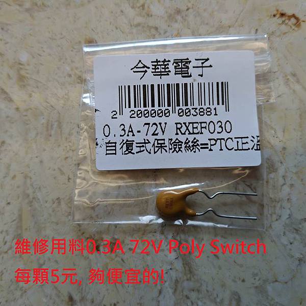 讓這個零件的金屬腳露出來,用個電夾把這個Poly Switch的兩腳短路,接下來串上電流表,再依車上接線的方式接好來做測試,測試的結果是照後鏡的動作可以到定位了,但是到定位之後馬達的電流不會切斷,這個狀況證實了那個poly switch 應該確定是損壞了,所以只要找到料應該就可以救回這兩個電折後視鏡,所以今天一早就到光華商場去找料,問了兩三家,終於在今華電子找到這個料,價格不高,我們要用的這個每顆五元,料件有了,就要來更換,