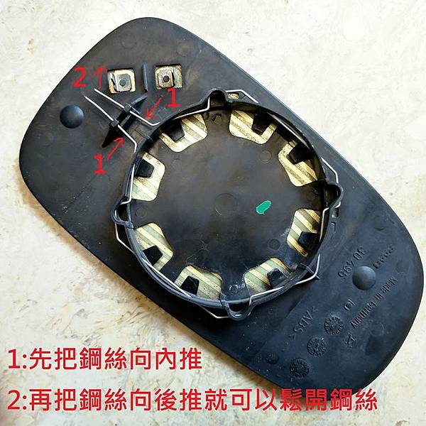 這幾週有去肉場找料,正好看到有台9-5有電折後視鏡,就拆了回來,至於拆裝的過程,因為網路上資源很多,我這邊就不再說明了,會拆這個是想幫我2000年的老車升級一下,所以包括那個電折的開關也一起拆了回來,不過依原廠線路接好測試過之後,動是會動,但是大概只會動個20~30度,根本沒辦法到定位,試了好多方法都沒用,決定把照後鏡給拆開研究一下,拆裝的方式不難,首先要把鏡片移除,把鏡片靠車身那頭盡量往外拉,鏡片後面有兩條鋼絲,先向內再向後推,把鋼絲推離開固定的機構,鏡片就可以拔下來,請看照片: