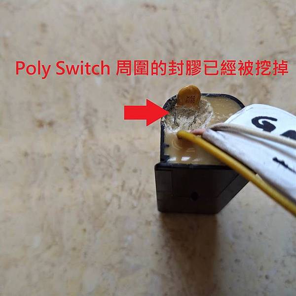 因為原廠模組有用膠封住,用個錐子把Poly Switch 週邊的封膠都挖掉,小心不要傷到內部的電路,挖開後把Poly Switch 由頭部剪掉,請看照片: