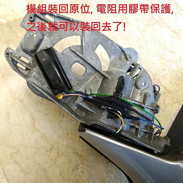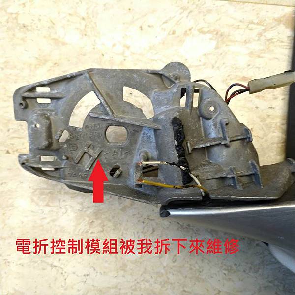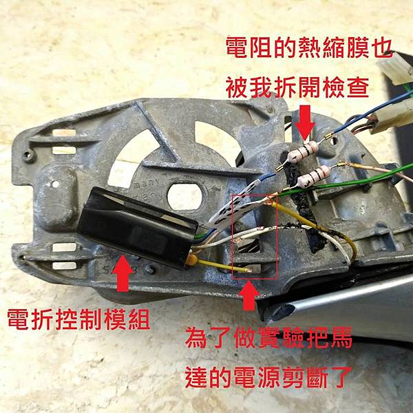 拆開之後發現在照後鏡的背面有個控制電路,就是那個長方形黑色的小盒子,因為動作不良,所以我把那個控制電路剪掉,直接供電給馬達,請看照片: