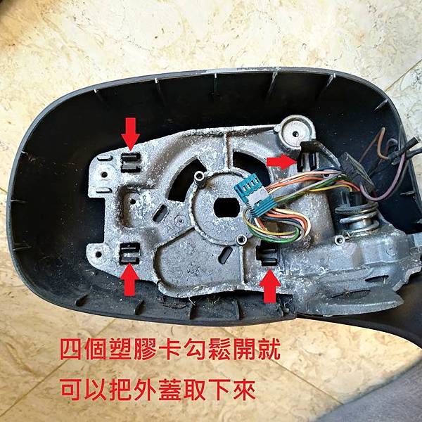 最後把照後鏡背面的塑膠殼拆掉,這個在內面有四個塑膠卡勾,用一字起子把卡勾推開就可以取下來,請看照片:
