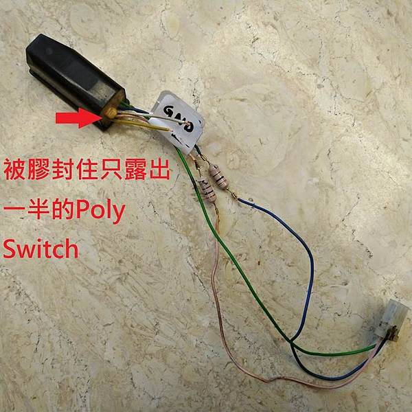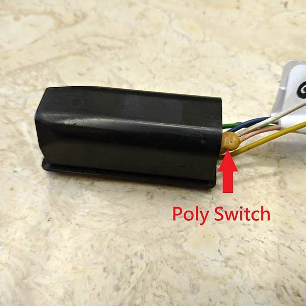 本來還在想要如何處理,不過社團內的車友提供了一個訊息,有車友說把露在黑色模組外面的Poly Switch換掉就可以修復,所以我做了個實驗,先把原本膠封的部份挖開,請看照片: