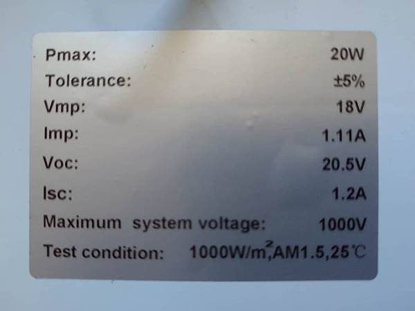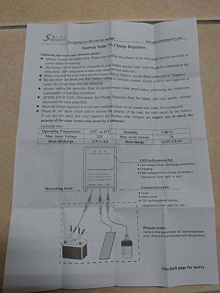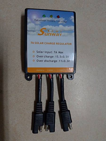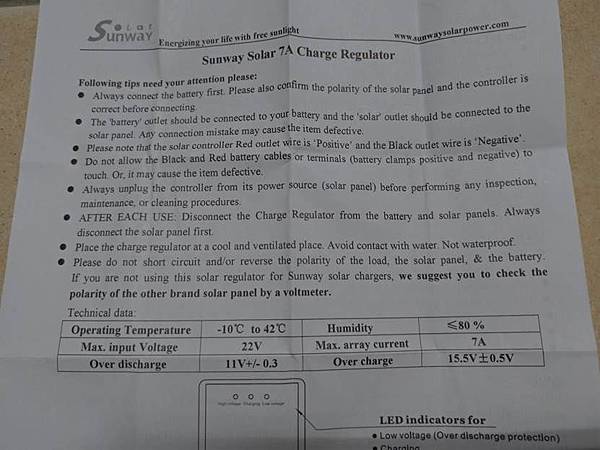 網路上可以看到部份更簡單的系統是沒有充電控制器,就太陽能板直接連到電瓶,這樣有個問題就是第一效率不好,第二電瓶可能過充,而我用的這個充電控制器是有過充保護的設計,如果電瓶的電壓已經太高,會自動停止充電,另外在選用太陽能板及充電器的時候要注意一下,電壓及電流的規格是否符合,我用的充電器最大耐壓22V, 電流7A,而我用的20W太陽能板最大的Voc是20.5V,Isc是1.2A,所以搭配是沒有問題的,規格比對如下, 第一張是太陽能板的, 第二張是充電器的:
