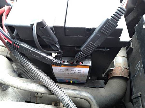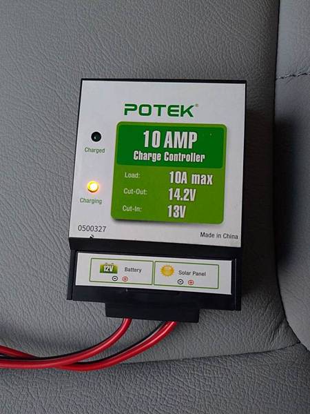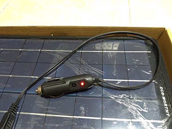 再來就是接線,我用的也是同一家廠商出的線材,耐電流5A是OK的,需要注意的是充電控制器接電瓶及接太陽能板的端子,正負要接正確,要不然有可能把充電器搞壞掉,另外要特別注意的是要先接電瓶,再接太陽能板,如果接線都正確,控制器上的黃色Charge (充電)的LED 就會亮起來了,這樣就算大功告成,以目前八九月台灣的天氣,大概早上七點左右就會開始進入充電狀態,正中午大太陽的時候,充電電流應該有機會超過1A以上,以這樣的電流來補車輛的靜態電流消耗絕對是足足有餘的,這部份我會過幾週再來確認,下面就是安裝在零件車上的照片: