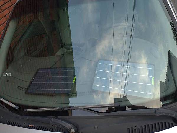 另外我常在開動的車輛我也做了另外一組是放在前檔玻璃下面, 用的零件有點不同, 但架構是一樣的, 只是放在車內, 直接連上點煙器, 因為Taurus 的點煙器在車輛熄火的狀態下還是有直接連到車上的電瓶, BMW E38 也是這樣的架構, 因此也可以用這樣的方式來幫電池充電, 這部份因車輛不同而有差異, 有想用的車友須要確定一下, 如果點煙器熄火之後就不供電, 那就要拉線到電瓶, 這個車內用的系統與上面介紹的系統的差異是太陽能板我是用兩片並聯, 因為在車內怕一片能量不太足夠, 而且我買到的一片只有10W, 兩片也才20W, 下面就是安裝的照片: