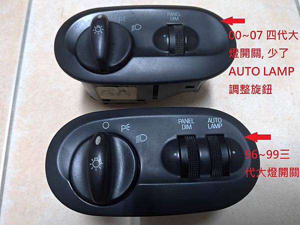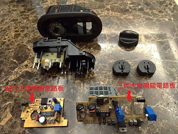 拆下來之後把背面六個卡勾稍微翹一下就可以把電路板拆出來,電路板下來之後對那個可變電阻研究了一下,看來是專用料,因為與通用品相比較,高度不同,軸心直徑不同,可動的旋轉角度也不一樣,所以最後還是要找原廠料件來更換,因為三代TAURUS年代有點久,所以上EBAY找了四代的大燈開關來拆料,這個料件含運到台灣花了七百多塊,不過可以看到外觀上少了一個AUTO LAMP的調整旋鈕,其實由每一代的演進感覺原廠一直在想辦法COST DOWN,感覺真的不是很好,其實不只FORD這樣做,其他車廠也多少有類似的狀況,實在有點看不太下去,所以有時候年份舊一點的車反而耐用,兩代大燈開關的比較可以看下面這張照片: