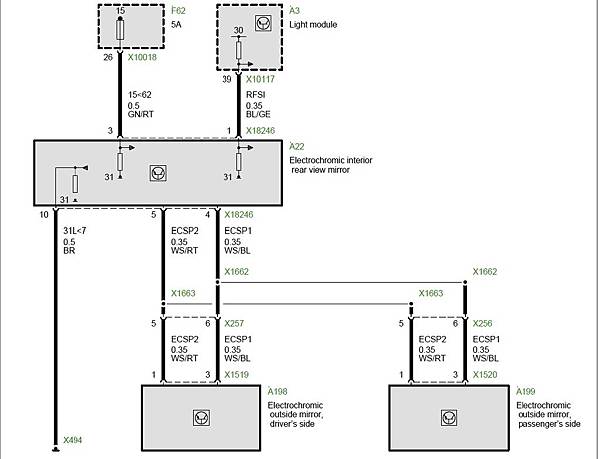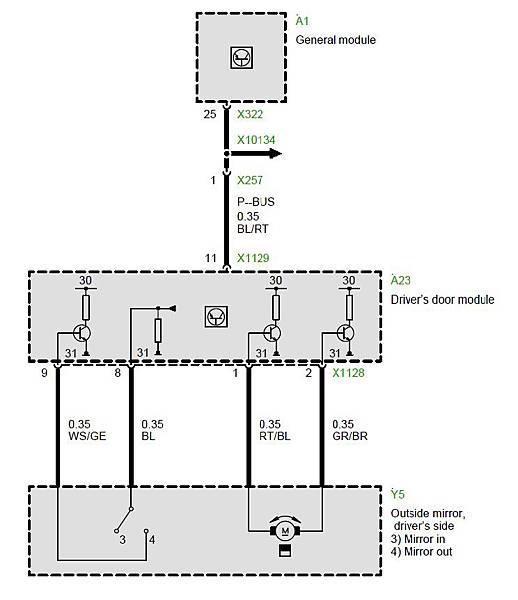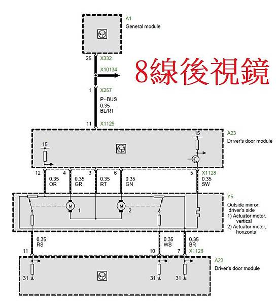 E38的後視鏡依車輛配備等級的不同有好幾種規格,比較常見的是8線及14線兩種,所謂的8線就是支援電調,後視鏡記憶功能及鏡片加熱,而14線就再增加電折及自動防眩光功能,相關的電路可以看下面: