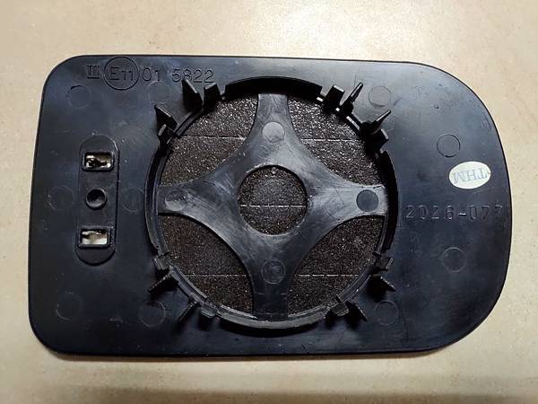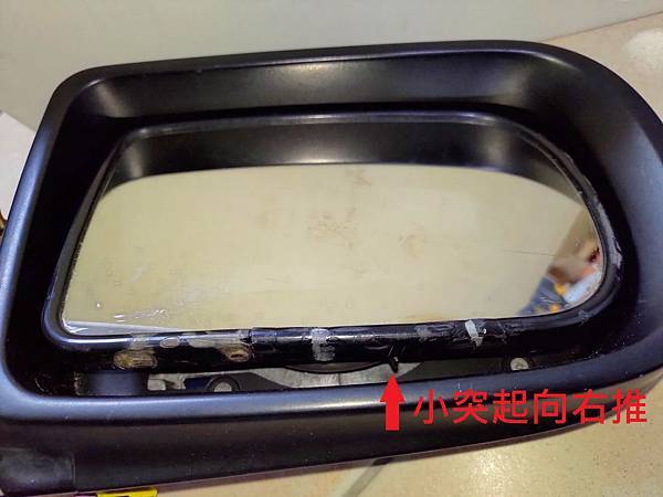 後視鏡拆下來之後要先把鏡片取下來,取下來的方式也很簡單,把鏡片向上抬起來,在鏡片的下方可以看到一個尖尖的的小突起: