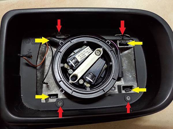 取下來之後可以看到後視鏡的前框有四個小螺絲(紅色箭頭所指)固定在鋁質的支架上面,把這四個螺絲拆掉就可以把前框取下來,外蓋的部分有四個卡榫(黃色箭頭所指)卡在支架上面,請看照片: