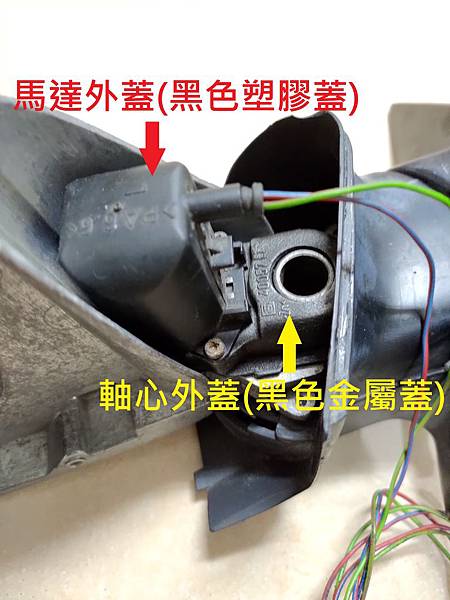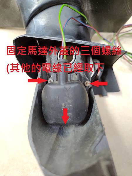 馬達的外蓋是個黑色的塑膠,由三個螺絲固定,把這三個螺絲拆掉就可以把整個馬達的塑膠外蓋取下來,請看照片: