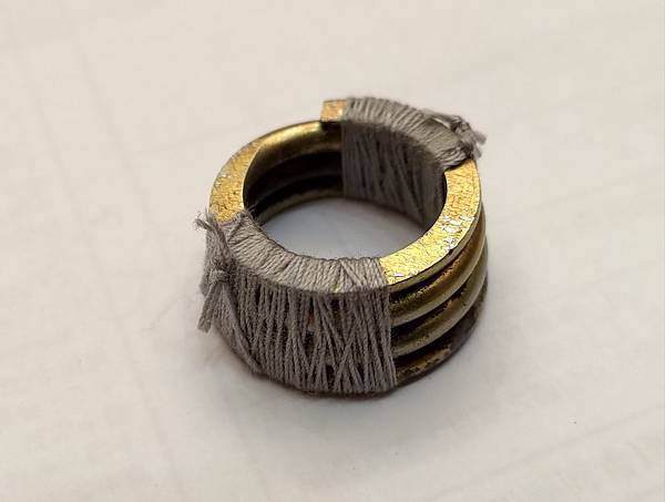 讓彈簧高度處於壓縮狀態,也就是壓到最短的狀態,把這個壓縮狀態的彈簧套上軸心,這時候卡簧就可以非常輕鬆地套上去,套上之後用打火機把綁住彈簧的線燒掉,這樣彈簧就可以伸展開來把整個軸心撐得很緊就大功告成,請看下面的圖片: