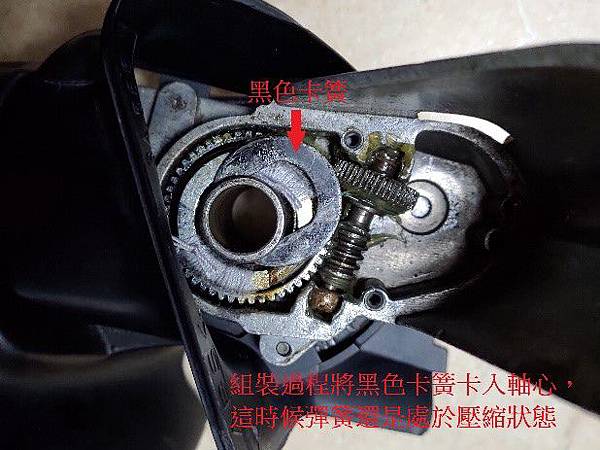 在取下來之前要把線先拉掉,不過線路的接頭是沒辦法穿過軸心的,所以要把電線由接頭內拆出來,這樣才能穿過軸心,或是暴力一點直接剪掉之後要組回去的時候再來焊接,其他的線路先拉掉之後再把那個馬達的電線防水塞先拉出來,馬達的電線也要先拉長一點,這樣塑膠罩子才拉得開,罩子取下之後就可以拉著馬達把整個照後鏡軸心的蓋子取下來,軸心是由一個黑色的卡簧卡在軸心上被彈簧頂住,這個彈簧的力量算是強的,在拆那個卡簧的時候先用個一字起子把卡簧向外推,之後再用尖嘴鉗取下來,拆的時候彈簧不要對著人,因為卡簧拆掉的時候彈簧的力量很大,有可能零件會飛出來,如果打到眼睛會有點危險,如果擔心零件飛出來,在拆之前可以先用個粗一點的束線帶先穿過軸心綁一下,這樣零件就不會飛出來,線路都拉掉之後幾個齒輪就可以輕鬆取下來了,總共有三個齒輪,請看下圖: