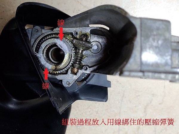 不過換好之後組裝有碰到個問題,在這邊撐了好久一直沒辦法破關,就是我說的那個套在軸心上的彈簧彈力太強,因此在組回去的時候一直沒辦法把彈簧壓下去讓卡簧可以卡在軸心上,試了很多方法都失敗,最後想了一個怪招,先用兩個鯉魚鉗左右夾住壓縮彈簧,之後用線把彈簧綁死,請看下圖: