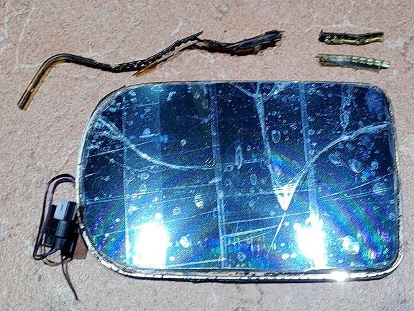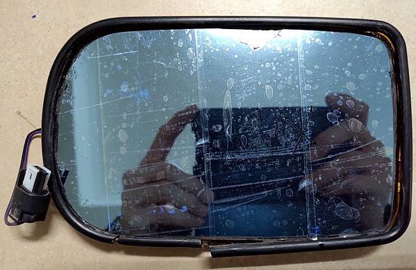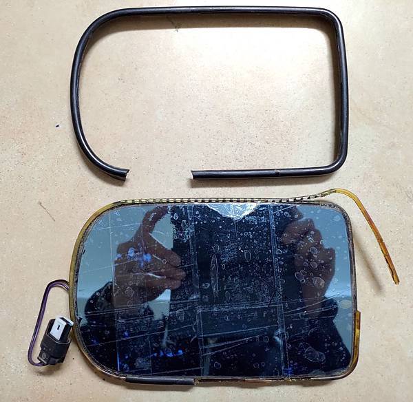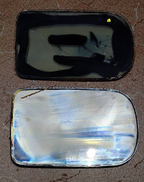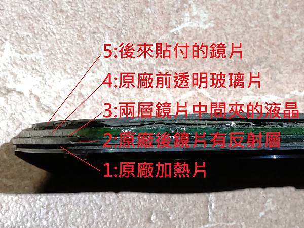 接下來講一下鏡片的部分,其實E38/39 損壞的自動防炫光後視鏡片是可以再利用的,原廠E38/39配備的自動防炫光後視鏡片我個人覺得很好用,晚上後方有強光的時候會自動變暗,比較不會刺眼,但是用了一段時間之後就可能會失效,因為鏡片價格比較高,很多車友不想花錢,就直接貼一塊鏡片在外面,這種修復方式雖然省錢,但是防眩光及電熱的功能就失效,因為加熱是做用在最下面那塊鏡片,貼了新鏡片隔了一層膠要加熱到外面那層鏡片夠熱難度很高,其實有個方式可以修復不影響電熱功能只有防炫光功能失效,原廠防炫光鏡片結構是四層,最下面是加熱片,第二層是鏡片,第三層是液晶,第四層是透明玻璃,因此我們只需要把透明玻璃與最下面的鏡片分離,中間的液晶把它擦乾淨,就可以有一塊有電熱,但是沒有防炫光功能的鏡片,請看下面的說明: