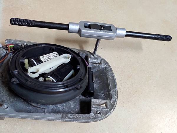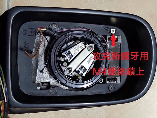不過在照後鏡修好要鎖上前框及外蓋的時候發現有一顆螺絲滑牙鎖不上,所以用個M4的螺絲攻把原本的M3螺絲孔擴孔同時供出新的螺紋再用M4的螺絲固定這樣就算完成: