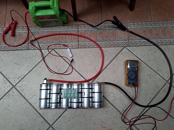 電源線用4 AWG的線,外直徑10mm,導體直徑有8mm,應該夠用了,線頭壓合後有上焊錫確保經久耐用,接好之後拿個紙箱絕緣一下,先上車測試,要上車之前先要對超級電容充電,要充滿到12V,如果沒充電就接上電瓶,會有瞬間大電流通過,火花很大,會有點危險,充電的時候用個12V電瓶接10 Ohm/20W的電阻,讓電容慢慢充到12V,大概要一個小時左右,如下圖: