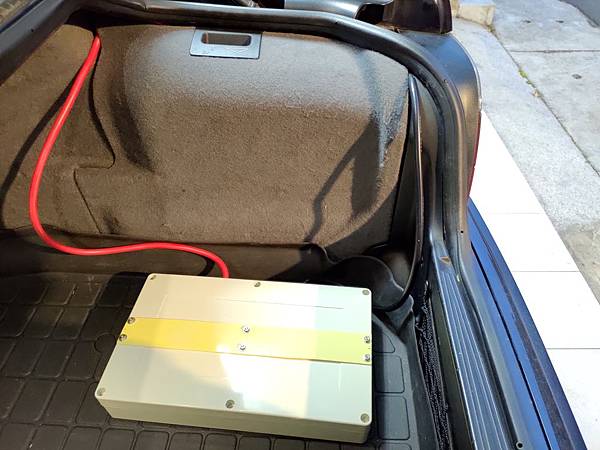 但也只是這樣,可能我比較不敏感,因為車開起來感覺沒什麼不同,但是理論上電壓穩定對車上的電系模組是有好處的,而且電瓶壽命也會比較長,試完之後還是要裝個像樣一點的機殼,一樣在淘寶找了一組防水盒,寬度厚度都適合,但高度太高,所以就把中間太多的部份切了,鋁板改放後面,裝好之後如下圖: