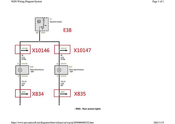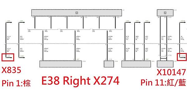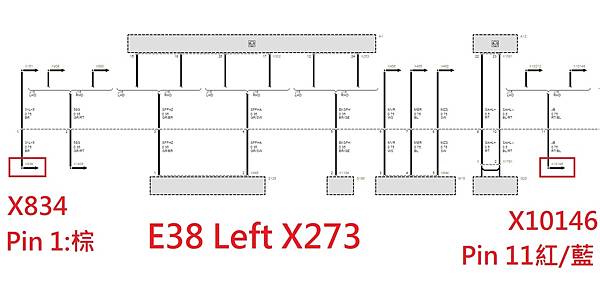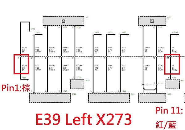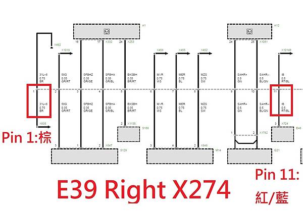 再下來就是接線,車門照地燈的線路是我們要接的地方,最容易就手的地方是在B柱,請看下面的線路圖,基本上38 & 39 都是在後車們線組的Pin 1 & Pin 11,其中Pin 1是GND(棕色),Pin 11是車們照地燈的訊號(紅色/藍色),線路圖如下,前三張是E38, 後兩張是E39: