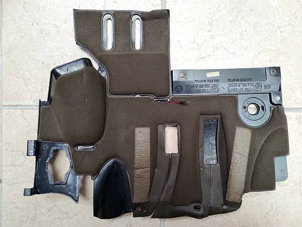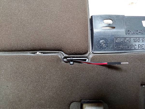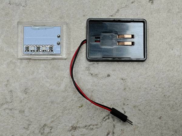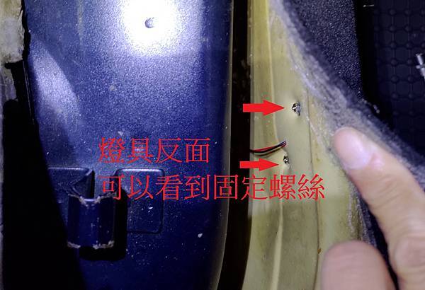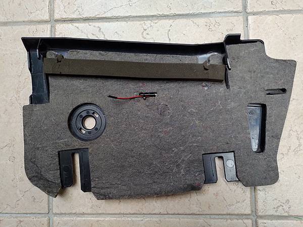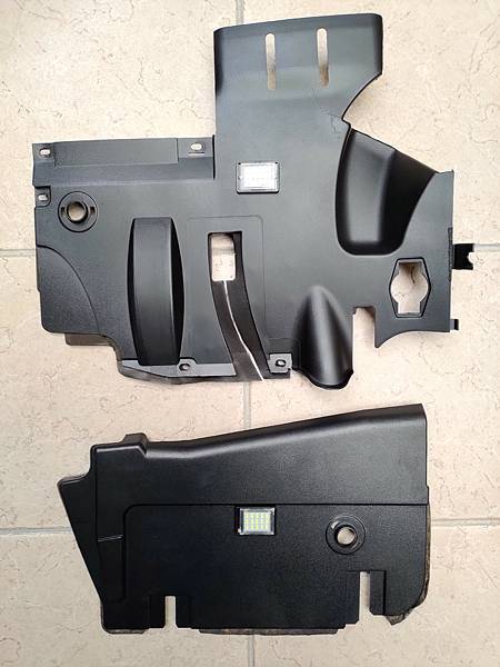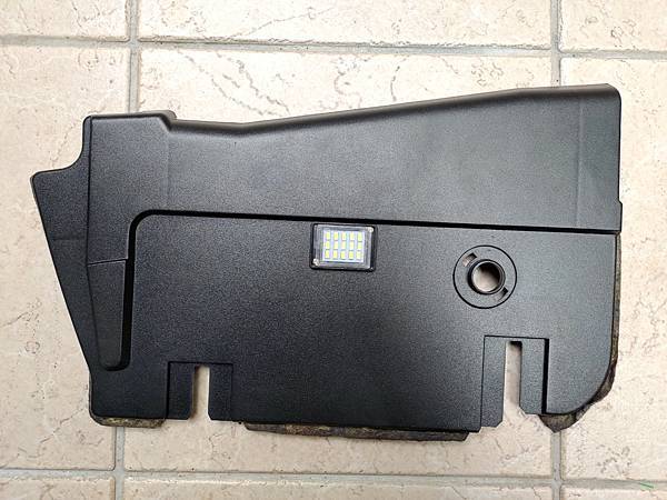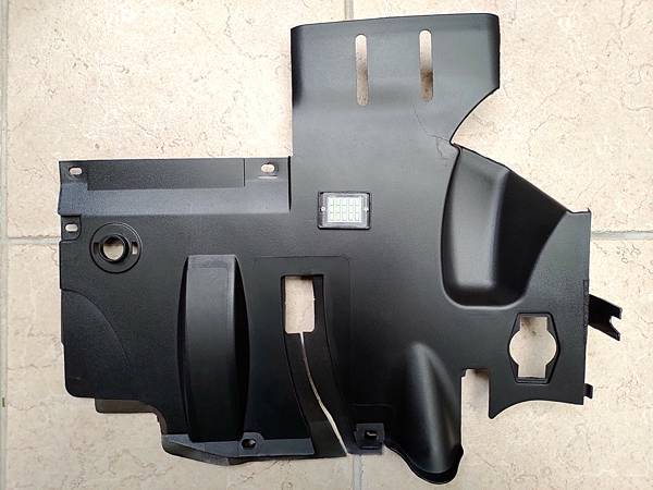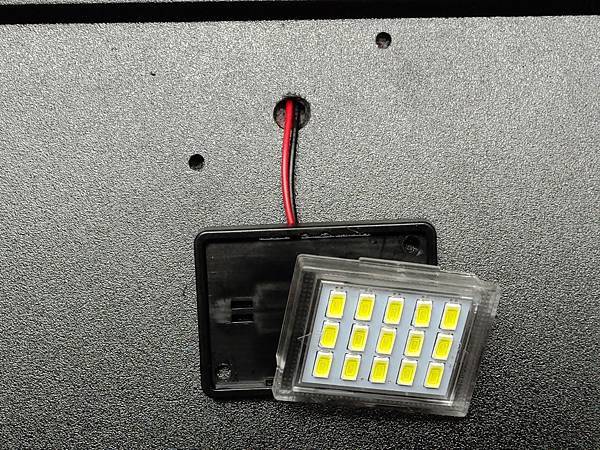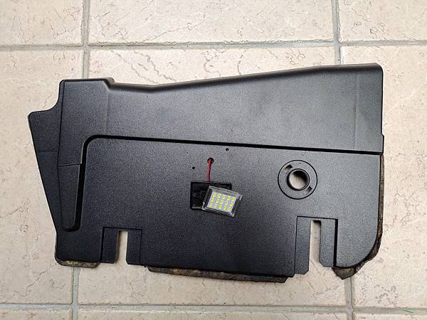 再來把中控台下方左右兩塊飾板拆下來,前面的室內燈要裝在這上面,因為原本的燈具有開關的功能不過我們用不到,所以要先處理這個部分,把3M背膠拆掉,線組解焊,兩個彈片先挖掉,再把線組直接焊到LED的電路板上,焊完之後左右個鑽兩個孔,用小螺絲把燈具固定到飾板上面,照片如下: