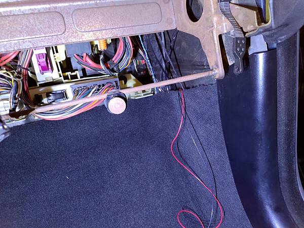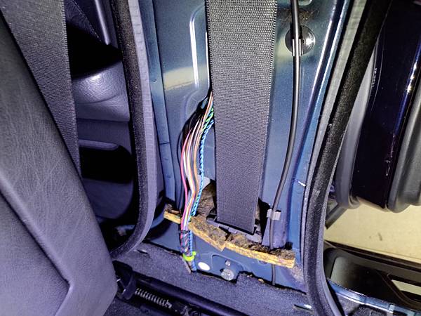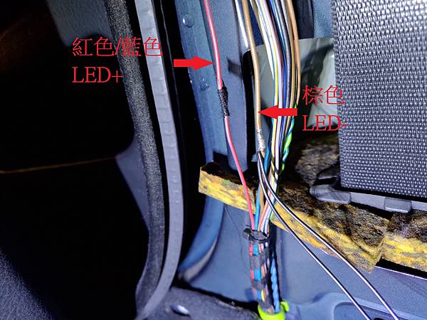 把B柱飾板還有周邊該拆的拆掉就可以看到後車門的線組在B柱,左右兩邊都一樣,我們要接的有兩條線,一條是紅色/藍色,這條是LED+,另一條棕色,這條是LED-,左右兩邊的B柱都是接一樣的線,我在接的時候左右邊都各接兩組,因為有前座的還有後座的,所以單邊有兩組一共四條線,要拉到前面或是後面的線就沿著地毯邊緣把線走到前面或是後面,再依燈具的位置把接頭焊好,再把燈接上就可以了。