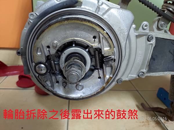 所以打定主意之後就開始拆車,首先要把原車的輪鼓電機拆下來,因為原廠的控制器是做在輪鼓電機的旁邊,拆車沒有什麼學問,先把輪胎拆掉,後擋泥板拆掉,後煞車線拆掉,鼓煞的煞車皮拆掉,輪鼓電機的側蓋就可以拆下來,拆下來就可以看到永磁的轉子,最後為了方便測試把整個輪鼓電機的總成由車架上拆下來,細節就不講了,下面就是拆下來的電機總成: