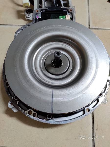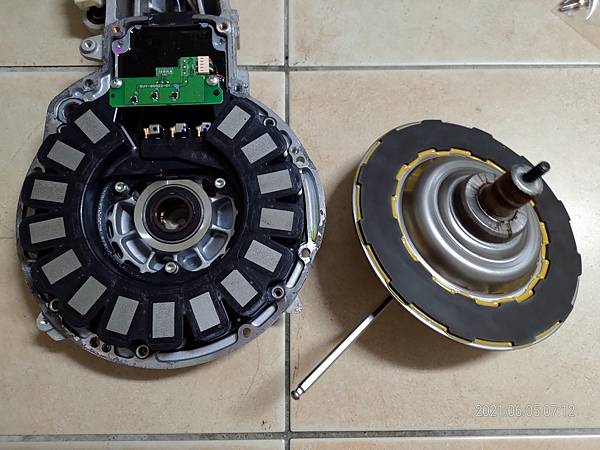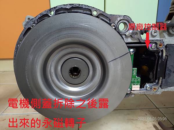 因為我們要把原廠控制器的模組拆掉,還有要測試原本電機上的霍爾感應器因此必須要把永磁的轉子先拆下來,這個部分有點小竅門,因為這個永磁的轉子磁力很強,單要靠手的力量是沒有辦法把轉子拔起來的,看了原廠的維修手冊有寫要拿一個螺紋長度大於2CM的M8螺絲插入中心孔,然後順時針轉動,整個永磁轉子就會被舉升上來,等到高度夠高之後磁力就會減弱,這時候才能用手把轉子取下來,而這個M8的螺絲在電機總成的固定螺絲就有兩根黑色的M8螺絲是符合這個要求的,因此直接拿來用就可以,請看下面的照片: