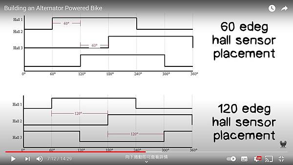 這位原作他在前半段用的就是無感應器的控制方式,其實無感應器只是利用沒通電的那一組線圈上的自感電壓來做控制,所以才能感應轉子的位置,只是相較有感應器的方式還是會多少有一點限制,影片中有特別把60度及120度擺放的霍爾感應器的波形畫出來,這個對於我們之後要判斷原廠EC-03的輪鼓電機它上面原本的霍爾是那一種也很重要,所以我先截圖PO上來說明一下: