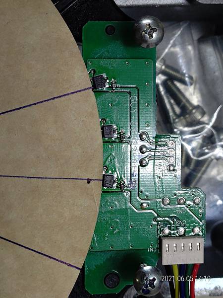 由上面照片可以更加確定原廠的霍爾擺放方式是60度,因為霍爾之間的間隔是10度角,為了解決這個問題,所以我們手工焊接了一塊120角度擺放方式的霍爾感應PCB,霍爾與霍爾之間的夾角為20度,另外特別說明一下我焊接的這一塊PCB上的霍爾感應器由左邊數過來第一個的位置與原廠第一個的位置是相同的,第二個霍爾感應器的位置與原廠第三個的位置是相同的,第三個才是用角度的差異去推算出來的,至於為什麼要這樣做後面會再詳細說明,PCB焊接好之後照片如下: