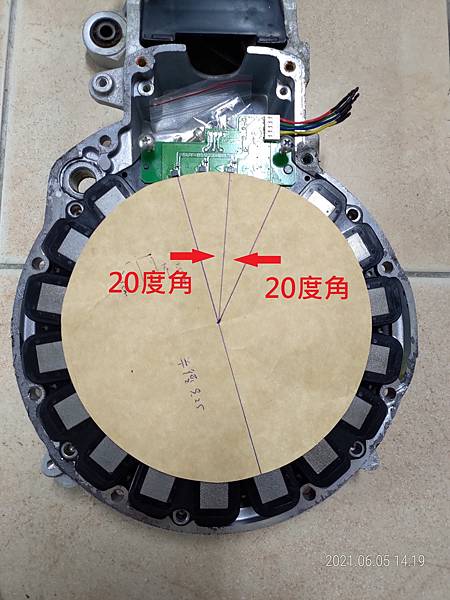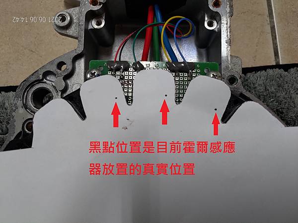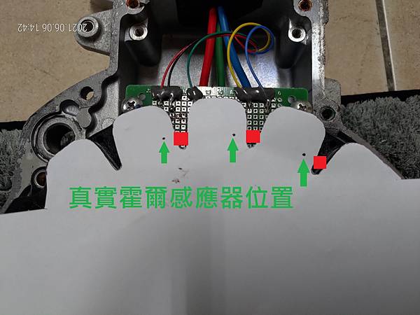 因為這個電機放霍爾感應器的區域沒有線圈,所以前面有說少三組線圈,我用紙把真實線圈的大小用紙型畫出來,大家可以看得出來目前霍爾感應器的位置沒有與線圈之間的間隙對齊,反而有一點向前移動,這邊講的向前是以電機轉動的方向來看,目前車輛要前進電機轉動的方向是順時針方向,所以說有提前,如果要對齊線圈之間的間隙,感應器的位置應該要放在第二張照片的紅色的位置才是正確的位置,針對這個問題我也研究了一下,Youtube上也有解答,請看一下這幾段影片: