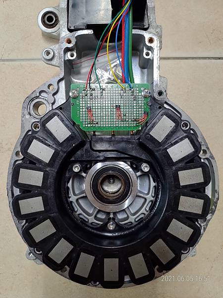 左上方的BOX是個配相的輔助儀器,這樣要由36種組合當中選出正確的組合會比較快速,不過運氣還不錯,第一次接的方式就是正確的方式,所以這個儀器沒有派上用場,測完這個輪鼓電機搭配我買的這個控制器功能正常,轉速也可以由電門控制,心理面的大石頭放下一大半,接下來說明一下那個霍爾感應器的位置問題,由上面的公式計算這三個霍爾感應器之間應該是正好一個線圈大小的間隔,可是眼尖的讀者應該可以感覺目前這三個感應器的位置應該是沒有完全對齊線圈與線圈之間的間隙,沒錯! 這部分可以看下面的照片: