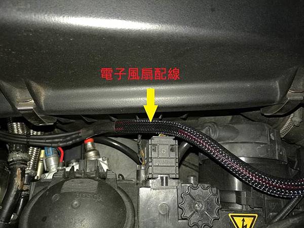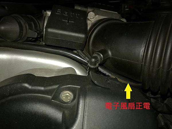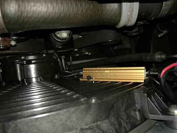 但眼尖的車友應該會看到我們有個電阻是放在風扇後面的, 就在引擎的前面, 這邊不是溫度最高的地方嗎? 說的沒錯, 如果各位去看舊文的照片, 電阻原本並不是固定在這邊的, 但是我們要先了解一下這個電阻的功能, 因為這個風扇是兩段的高低速控制, 因此在低速的時候我們須要有的電阻來降壓, 讓風扇轉速可以降下來, 因此在工作的時候, 這個電阻是會大量的發熱的, 所以這個電阻本身就是個熱源, 因此不能與其他的零阻件放在一起, 反而應該要放在一個可以幫助他散熱的地方, 而放在風扇的後方可以直接有風吹幫助電阻散熱自然就是個最好的地方, 如下圖: