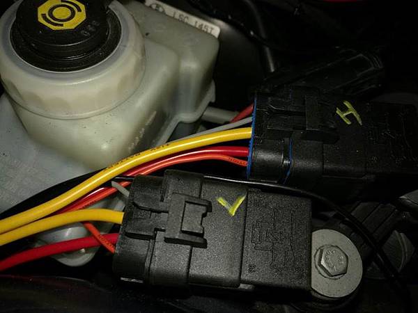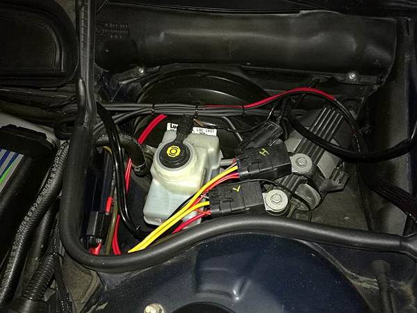 2:零組件擺放的位置要最佳化: 通常電子零件是怕熱的, 因此能夠盡量遠離熱源, 對於電子零件的壽命絕對是好的, 就以電容器來說, 工作溫度每降十度, 壽命就延長一倍, 降20度計等於延長四倍, 其他的零件也多少有類似的狀況, 所以在安裝這些電系的改裝品, 擺放的位置會影響使用的壽命, 以我們這次的改裝, 所有的控制電路都放在煞車油壺的那個區塊, 應該已經是引擎室內最不熱的區塊了, 如下圖:
