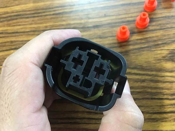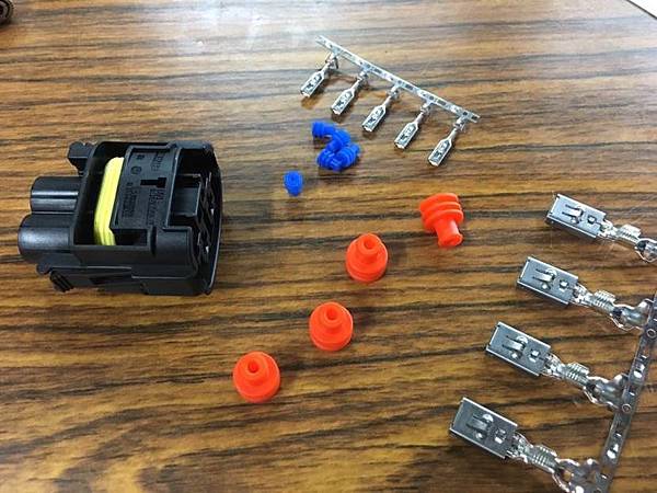 4:連接器架構的選擇: 剛才我們提到規格要足夠, 但除了規格之外還有其他的考慮, 以我們上面用的XT60而言, 規格是足夠了, 但是有一點疑慮就是他的接頭與端子之間是用焊接的, 我們都知道焊錫基本上是一種偏軟的金屬, 本身並沒有什麼機械性的強度, 因此如果長時間處於震動的環境下我認為會有點問題, 最好是端子本體有金屬片可以與電線壓合之後再用焊錫補強這樣應該是最完美的, 因此車廠老闆有幫忙預定了原廠的大功率風扇用的接頭, 大家可以看一下, 他的端子的結構就是四面八方完整包覆的, 而且端子後方也有金屬片可以與線材直接壓合, 還有防水防塵的膠套, 這樣才可以確保長時間使用的可靠度, 原廠這個接頭可以支援到1000W的風扇, 照片如下: